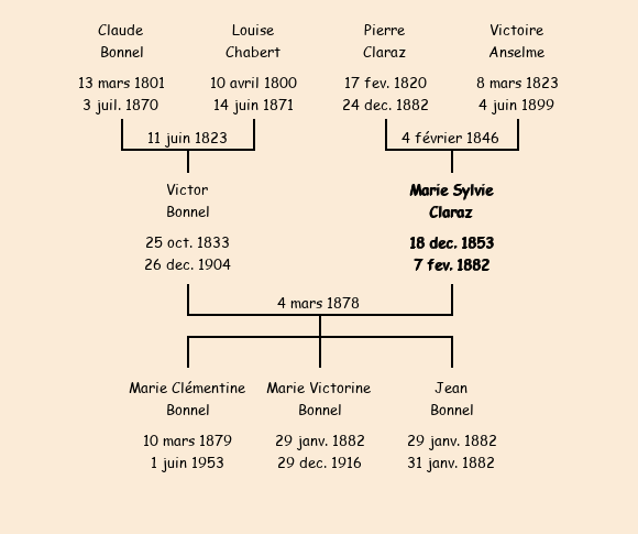 Epouse : Marie Sylvie Claraz (25 ans, née le 18 décembre1853, de Riortier Dessous, cultivatrice, a signé), fille de Pierre (cultivateur, a signé) et de Victoire Anselme (ménagère, a signé) |