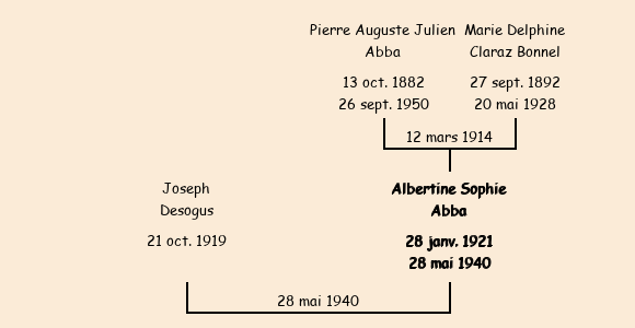 Epouse : Albertine Sophie Abba (19 ans, née à Fontcouverte le 28 janvier 1921, du Suel), fille de Pierre Auguste Julien et de Marie Delphine Claraz Bonnel |
