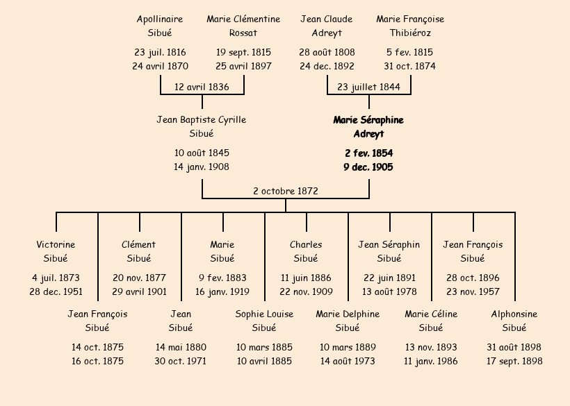Epoux : Cyrille Jean Baptiste Sibué (27 ans, né le 10 août1845, soldat de l'armée d'active, a signé), fils de Apollinaire (décédé le 24 avril1870) et de Clémentine Rossat (ménagère, n'a pas su signer) |