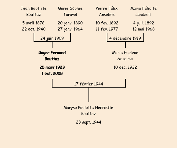 Epoux : Rogé Fernand Bouttaz (20 ans, né à Fontcouverte le 2 mars1923, domicilié au Chef Lieu), fils de Jean Baptiste et de Marie Sophie Taravel |