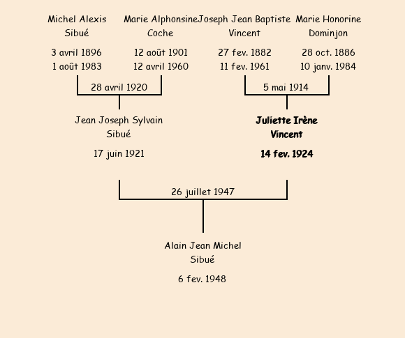 Epouse : Juliette Irène Vincent (23 ans, née à Fontcouverte le 14 février1924, du Crêt), fille de Joseph Jean Baptiste (médaillé militaire) et de Marie Honorine Dominjon |