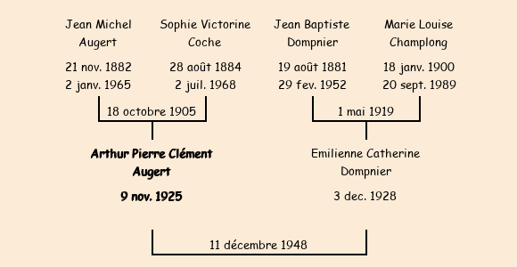 Epoux : Arthur Pierre Clément Augert (23 ans, né à Fontcouverte le 9 novembre1925, domicilié au Chef Lieu), fils de Jean Michel et de Sophie Victorine Coche |