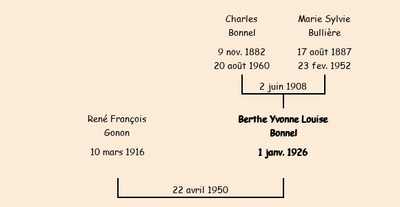 Epoux : René François Gonon (34 ans, né à Peronnas (Ain) le 10 mars1916, domicilié à Lyon 1er 19 rue Neyret, boucher), fils de François et de Marie Julie Drevet (domiciliés à Jujurieux (Ain), concierges d'usine) |