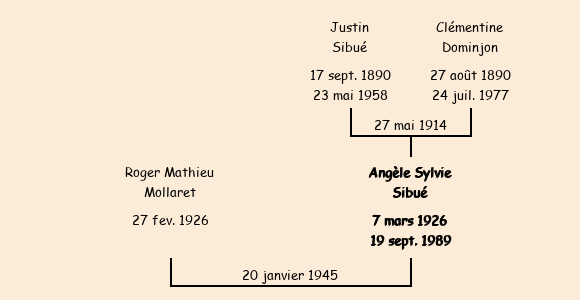 Epouse : Angèle Sylvie Sibué (18 ans, née à Fontcouverte le 7 mars1926, de Pierrepin Dessous), fille de Justin et de Clémentine Dominjon |