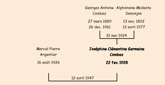 Epouse : Joséphine Clémentine Germaine Combaz (19 ans, née à Fontcouverte le 22f février1928, de Pierrepin Dessous), fille de Georges Antoine et de Alphonsine Modeste Dominjon |