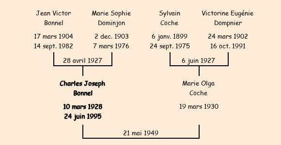Epoux : Charles Joseph Bonnel (21 ans, né à Fontcouverte le 10 mars1928, domicilié aux Anselmes), fils de Jean Victor et de Marie Sophie Dominjon |