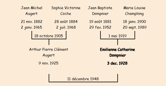 Epoux : Arthur Pierre Clément Augert (23 ans, né à Fontcouverte le 9 novembre1925, domicilié au Chef Lieu), fils de Jean Michel et de Sophie Victorine Coche |