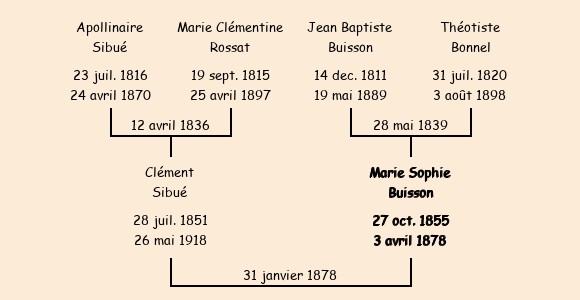 Epouse : Marie Sophie Buisson (23 ans, née le 27 octobre1855, cultivatrice, a signé), fille de Jean Baptiste (cultivateur, a signé) et de Théotiste Bonnel (cultivatrice, n'a pas su signer) |