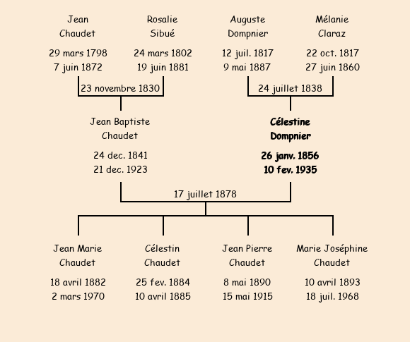 Epouse : Célestine Dompnier (22 ans, née le 14 janvier 1856. (26 janvier), de La Martinettaz, cultivatrice, a signé), fille de Auguste (cultivateur, a signé) et de Mélanie Claraz (décédée le 27 juin1860) |