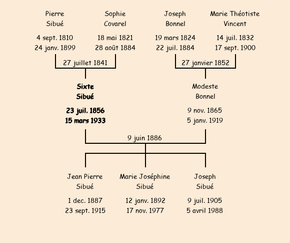 Epoux : Sixte Sibué (30 ans, né le 23 juillet1856, cultivateur à L'Alpettaz, a signé), fils de Pierre (cultivateur, a signé) et de Sophie Covarel (décédée le 28 août1884) |