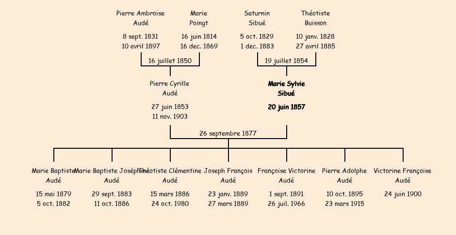 Epouse : Marie Sylvie Sibué (20 ans, née le 20 juin1857, de La Bize, cultivatrice, n'a pas signé), fille de Saturnin (cultivateur, a signé) et de Théotiste Buisson (cultivatrice, n'a pas su signer) |