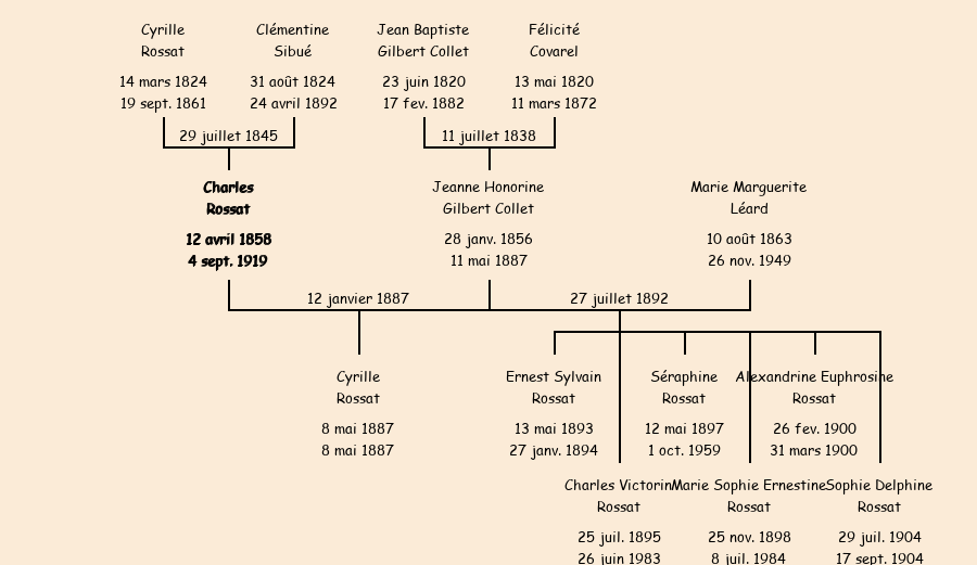 Epoux : Charles Rossat (29 ans, né le 12 avril1858, cultivateur, a signé), fils de Cyrille (décédé le 19 septembre1861) et de Clémentine Sibué (cultivatrice, n'a pas su signer) |