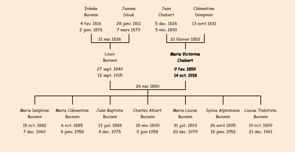 Témoins : Eugène Buisson fils d'Irénée décédé, 35 ans frère de l'époux, Jean Pierre Sibué fils d'Alexis, 24 ans cousin de l'époux, Charles Chabert fils de Jean, 27 ans frère de l'épouse, Jean Baptiste Dompnier fils de Théophile décédé, 32 ans ami des époux |