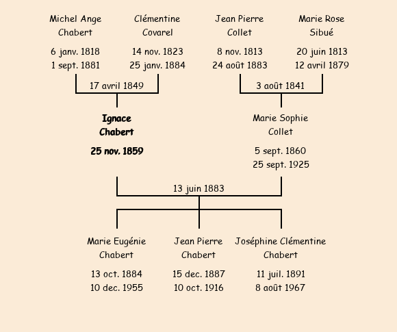 Epoux : Ignace Chabert (24 ans, né le 25 novembre1859, cultivateur aux Anselmes, a signé), fils de Michel Ange (décédé le 1er septembre1881) et de Clémentine Covarel (ménagère, n'a pas su signer) |