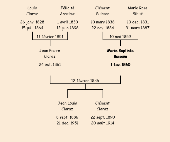 Epouse : Marie Baptiste Buisson (25 ans, née le 1er février 1860, de L'Alpettaz, cultivatrice, a signé), fille de Clément (décédé le 22 novembre1884) et de Marie Rose Sibué (cultivatrice, n'a pas su signer) |