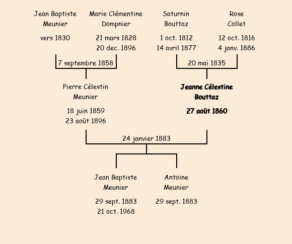 Epouse : Jeanne Clémentine Bouttaz (23 ans, née le 27 août1860, de Pierre Pin, cultivatrice, a signé (Jeanne Célestine à l'état religieux)), fille de Saturnin (décédé le 14 avril1877) et de Rose Collet (cultivatrice, n'a pas su signer) |