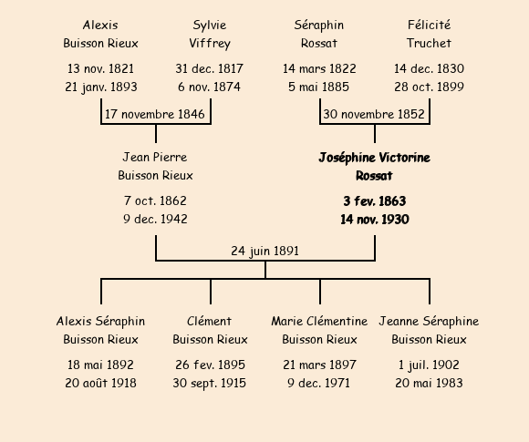 Témoins : Cyrille Truchet fils d' Alexis décédé, 48 ans beau frère de l'époux, Séraphin Truchet fils de Cyrille, 23 ans neveux de l'époux, Jean Cyprien Rossat fils de Séraphin décédé, 30 ans frère de l'épouse et Jean Cyprien Truchet fils de Jérome décédé, 59 ans oncle de l'épouse |
