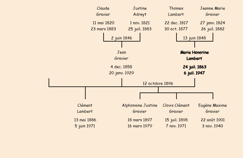Epouse : Marie Honorine Lambert (33 ans, née le 24 juillet1863, de La Brévière, cultivatrice, a signé), fille de Thomas (décédé le 30 octobre1877) et de Jeanne Marie Gravier (décédée le 26 juillet1882) |