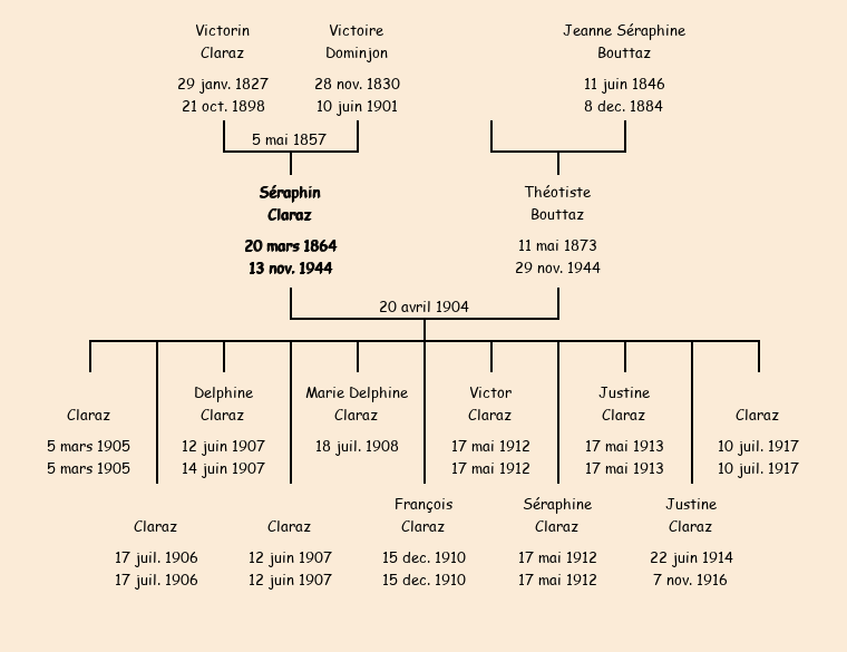 Epoux : Séraphin Claraz (40 ans, né au Crêt le 20 mars1864), fils de Victorin (décédé au Crêt le 21 octobre1898) et de Victoire Dominjon (décédée au Crêt le 10 juin1901) |