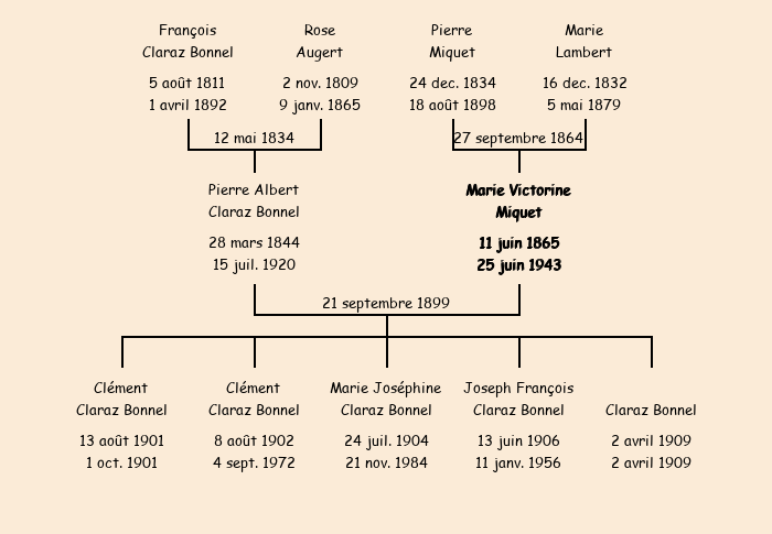 Epouse : Marie Victorine Miquet (34 ans, née le 11 juin1865, de La Crousaz, cultivatrice, a signé), fille de Pierre (décédé à La Crousaz le 18 août1898) et de Jeanne Marie Lambert (décédée à La Crousaz le 5 mai1879) |