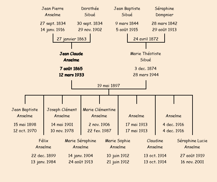 Epoux : Jean Claude Anselme (32 ans, né le 7 août1865 aux Anselmes, cultivateur aux Anselmes, a signé), fils de Jean Pierre (cultivateur aux Anselmes, a signé) et de Dorothée Sibué (cultivatrice, n'a pas su signer) |