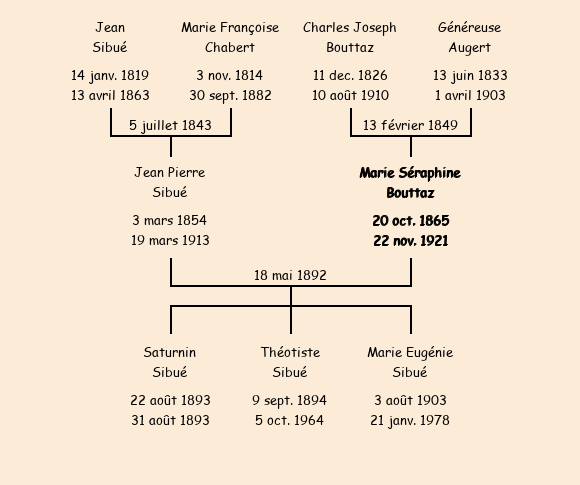 Epoux : Jean Pierre Sibué (38 ans, né le 3 mars1854, cultivateur à L'Alpettaz, a signé), fils de Jean (décédé à L'Alpettaz le 14 avril1863) et de Marie Françoise Chabert (décédée à L'Alpettaz le 30 septembre1882) |