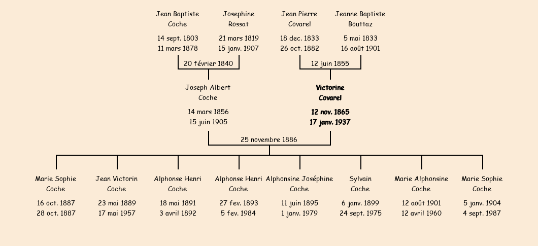Témoins : Jean Baptiste Bouttaz fils de Jean Pierre décédé, 44 ans secrétaire de mairie oncle de l'épouse, Jean Saturnin Covarel fils de Jean Pierre décédé, 27 ans frère de l'épouse, Clément Coche fils de Jean Baptiste décédé, 35 ans frère de l'époux, Jean Baptiste Bullière fils de Louis décédé, 36 ans, beau frère de l'épouse |