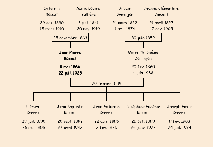Epouse : Marie Philomère Dominjon (29 ans, née le 20 février1860, de Pierre Pin, cultivatrice, a signé), fille de Urbain (décédé le 1er octobre1874) et de Jeanne Clémentine Vincent (ménagère, n'a pas su signer) |