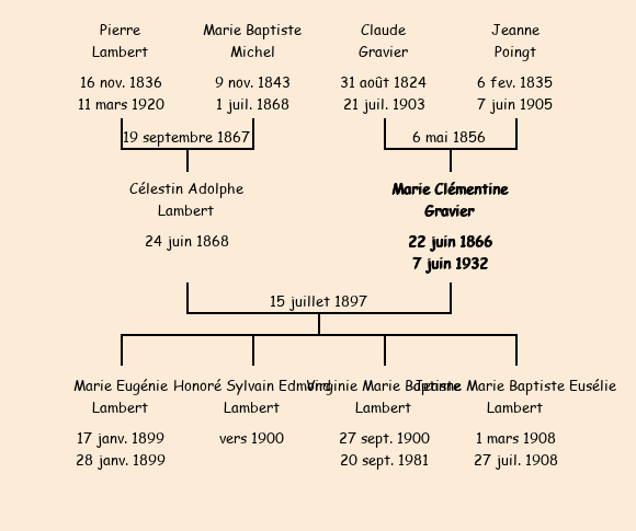 Epouse : Marie Clémentine Gravier (30 ans, née le 22 juin1866, de La Brévière, cultivatrice, a signé), fille de Claude (cultivateur à La Brévière) et de Jeanne Poingt (cultivatrice) |