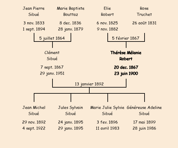 Epouse : Thérèse Mélanie Robert (25 ans, née le 20 décembre186, de Riortier Dessous, cultivatrice, a signé), fille de Elie (décédé le 9 novembre1882) et de Rose Truchet (ménagère, n'a pas su signer) |