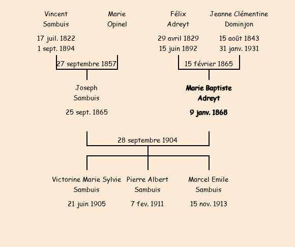 Epouse : Marie Baptiste Adreyt (36 ans, née à la Rochette le 9 janvier 1868), fille de Félix (décédé à La Rochette le 15 juin 1892) et de Jeanne Clémentine Dominjon |