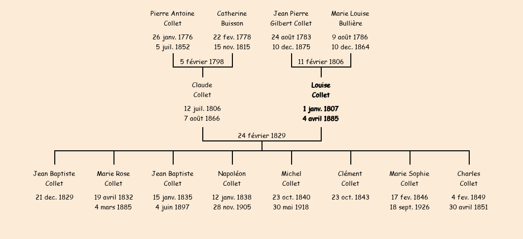 Epouse : Louise Gilbert Collet, fille de Jean Pierre et de Marie Louise Bullière |