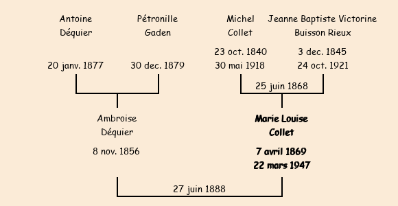 Mariée (19 ans) avec Ambroise Déquier (31 ans) le 27 juin 1888 à Fontcouverte ![]() |