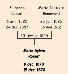 Père : Fulgence Rossat, fils de Jean Claude (charpentier, 50 ans, a signé) | Parrain : Auguste Sibué (fils de Pierre Antoine décédé) |