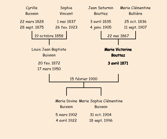Epouse : Marie Victorine Bouttaz (28 ans, née le 3 avril1871, des Anselmes, cultivatrice, a signé), fille de Jean Saturnin (cultivateur aux Anselmes, a signé) et de Marie Clémentine Bullière (cultivatrice, a signé) |
