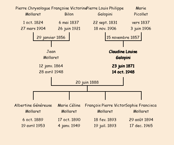 Témoins : Albert Mollaret fils de Pierre, 22 ans cultivateur à Fontcouverte frère de l'époux, François Galloppini fils de Pierre, 29 ans taillandier à Fontcouverte, frère de l'épouse, Léon Sibué fils d'Auguste décédé, 24 ans menuisier à Saint Jean, Joseph Dermy fils de Julien, 29 ans cultivateur à Saint Jean de Maurienne |