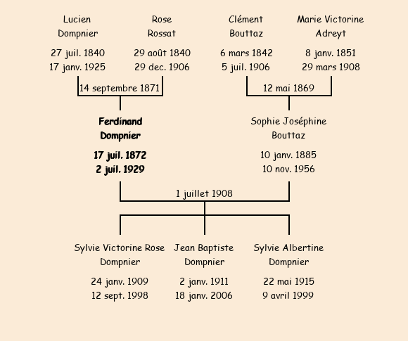Epouse : Sophie Joséphine Bouttaz (23 ans, née le 10 janvier 1885 à Pierre Pin), fille de Clément (décédé le 5 juillet1906 à Pierre Pin) et de Marie Victorine Adreyt (décédée le 29 mars1908 à Pierre Pin) |
