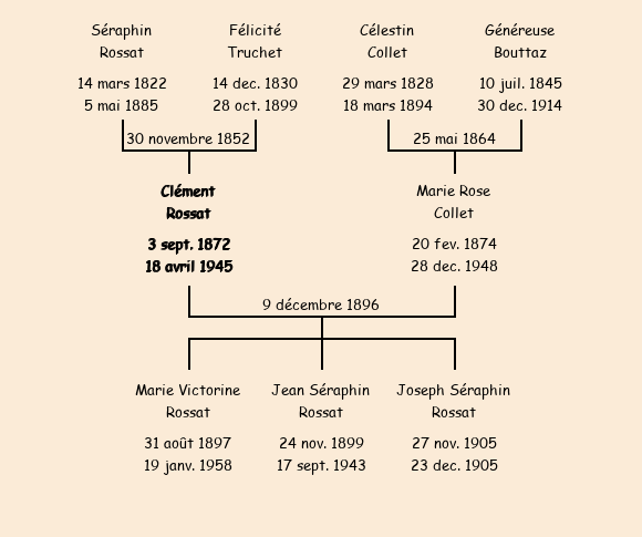 Epoux : Clément Rossat (24 ans, né le 3 septembre1872 à l'Alpettaz, cultivateur à L'Alpettaz, a signé), fils de Séraphin (décédé le 5 mai1885) et de Félicité Truchet (ménagère, n'a pas su signer) |