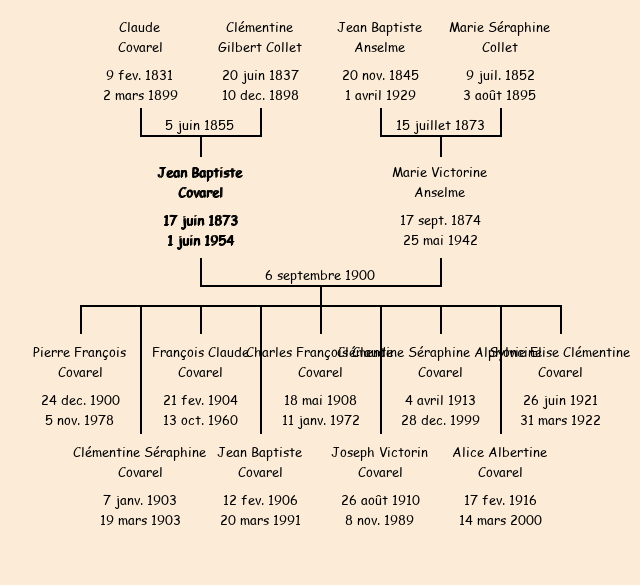Epoux : Jean Baptiste Covarel (27 ans, né le 17 juin1873 à La Rochette, cultivateur à La Rochette, a signé), fils de Claude (décédé à La Rochette le 2 mars1899) et de Clémentine Gilbert Collet (décédée à La Rochette le 10 décembre1898) |