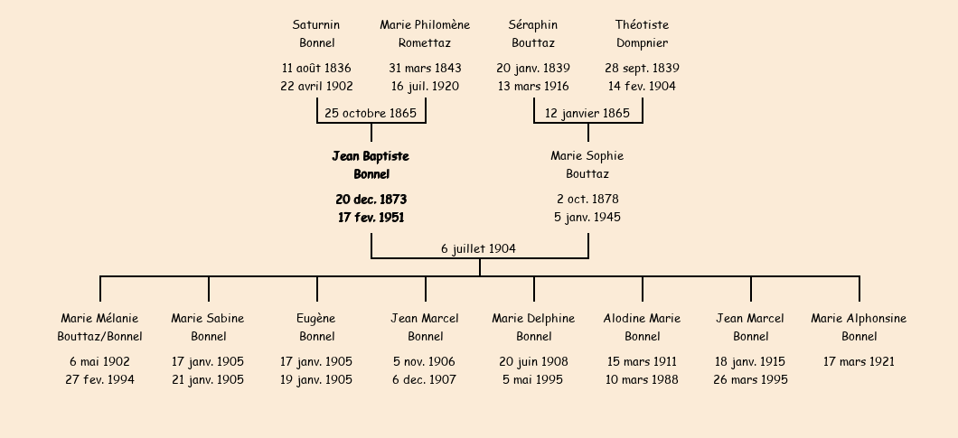Epouse : Marie Sophie Bouttaz (25 ans, née à La Bize le 2 octobre1878), fille de Séraphin et de Théotiste Dompnier (décédée à la Bize le 14 février1904) |