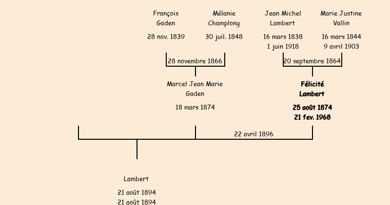 Epouse : Félicité Lambert (21 ans, née le 25 août1874, du Villard, cultivatrice, a signé), fille de Jean Michel (cultivateur au Villard, a signé) et de Marie Justine Vallin (cultivatrice, n'a pas su signer) |