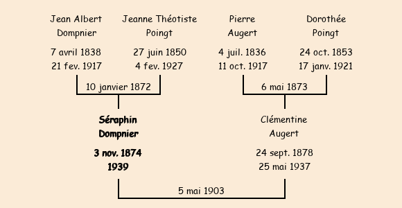 Epoux : Séraphin Dompnier (29 ans né le 3 novembre1874, domicilié aux Plans, commune de Saint Jean de Maurienne), fils de Jean Albert (vivant, né à Fontcouverte domiciliés au hameau des Plans commune de Saint Jean de Maurienne) et de Jeanne Théotiste Poingt (vivante, née à Fontcouverte domiciliés au hameau des Plans commune de Saint Jean de Maurienne) |