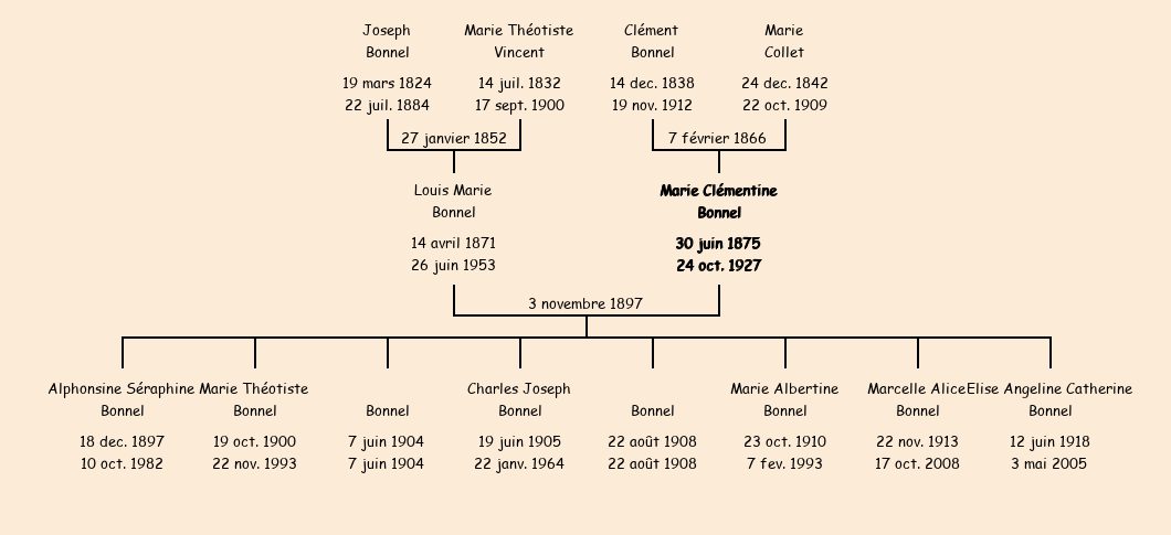 Epouse : Marie Clémentine Bonnel (22 ans, née le 30 juin1875, des Anselmes, cultivatrice, a signé), fille de Clément (cultivateur aux Anselmes, a signé) et de Marie Collet (cultivatrice, a signé) |