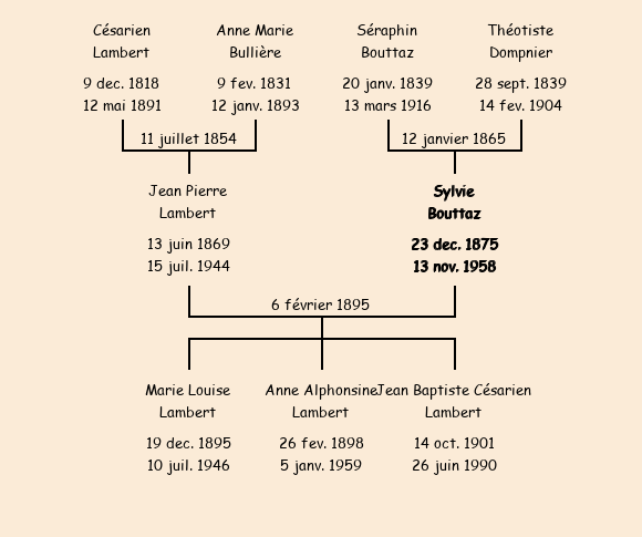 Epoux : Jean Pierre Lambert (26 ans, né le 13 juin1869, cultivateur aux Lamberts, a signé), fils de Césarien (décédé le 12 mai1891) et de Marie Anne Bullière (décédée le 12 janvier 1893) |