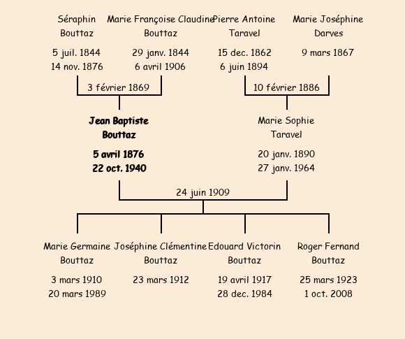 Epoux : Jean Baptiste Bouttaz (33 ans, né et domicilié au ChefLieu, le 5 avril1876), fils de Séraphin (décédé au Chef Lieu le 13 novembre1876) et de Marie Françoise Claudine Bouttaz (décédée au Chef Lieu le 6 avril1906) |