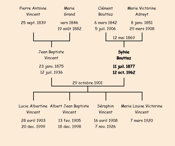 Epouse : Sylvie Bouttaz (24 ans, née le 11 juillet1877 à Pierre Pin), fille de Clément et de Victorine Adreyt |