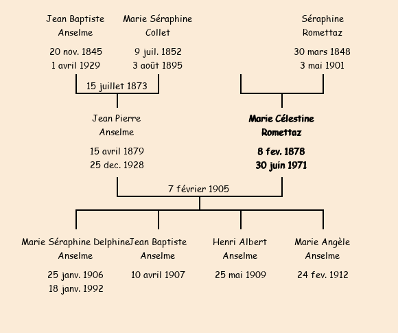Epoux : Jean Pierre Anselme (26 ans, né le 15 avril1879 aux Anselmes, charpentier, domicilié à Saint Jean de Maureinne), fils de Jean Baptiste et de Marie Séraphine Collet (née et décédée aux Anselmes le 3 août1895) |