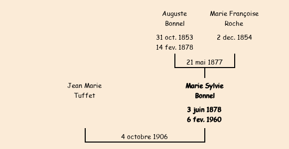 Mentions marginales : Mariée avec Jean Marie Tuffet à Moutiers (Savoie) le 4 octobre1906, décédée le 6 février 1960 (Mars dans une autre version) à Riorges (Loire), CA Riorges |
