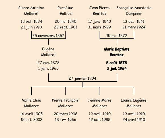 Epoux : Eugène Mollaret (25 ans, né le 27 novembre1878 aux Rossières banlieue de Saint Jean de Maurienne), fils de Pierre Antoine et de Perpétue Gallice (décédée aux Rossières le 22 septembre1901) |
