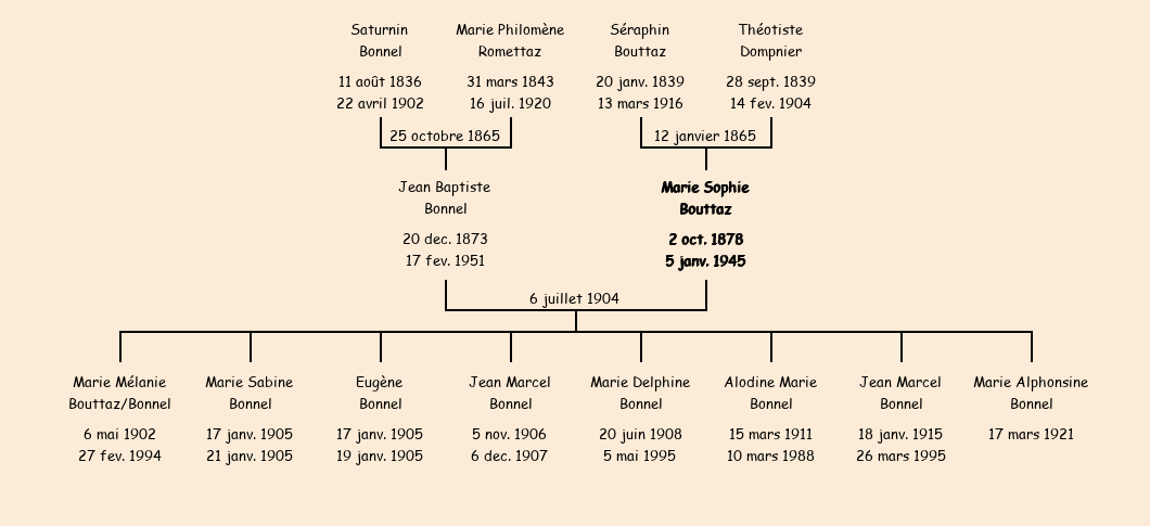 Epouse : Marie Sophie Bouttaz (25 ans, née à La Bize le 2 octobre1878), fille de Séraphin et de Théotiste Dompnier (décédée à la Bize le 14 février1904) |